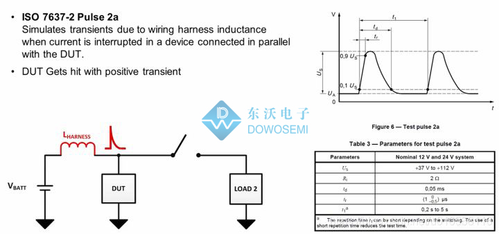2)ISO 7637-2 PULSE 2a:PULSE 2a浪涌波形是用来模拟供电线束上的杂散电感,如下图,由于并联的某个负载断开,造成供电处线束杂散电感中电流变化,进而产生一个正的电压叠加到供电处,这个就需要产品供电端口存在浪涌钳位器件。