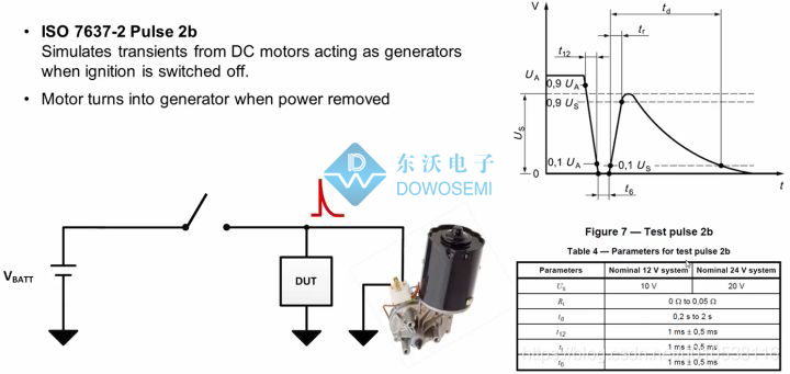 3)ISO 7637-2 PULSE 2b:PULSE 2b浪涌波形是用来模拟产品与直流电机并联时,当供电断开后,直流电机就等效成了发电机,产生了一个正向的电压施加到供电处,有点像能量回收。